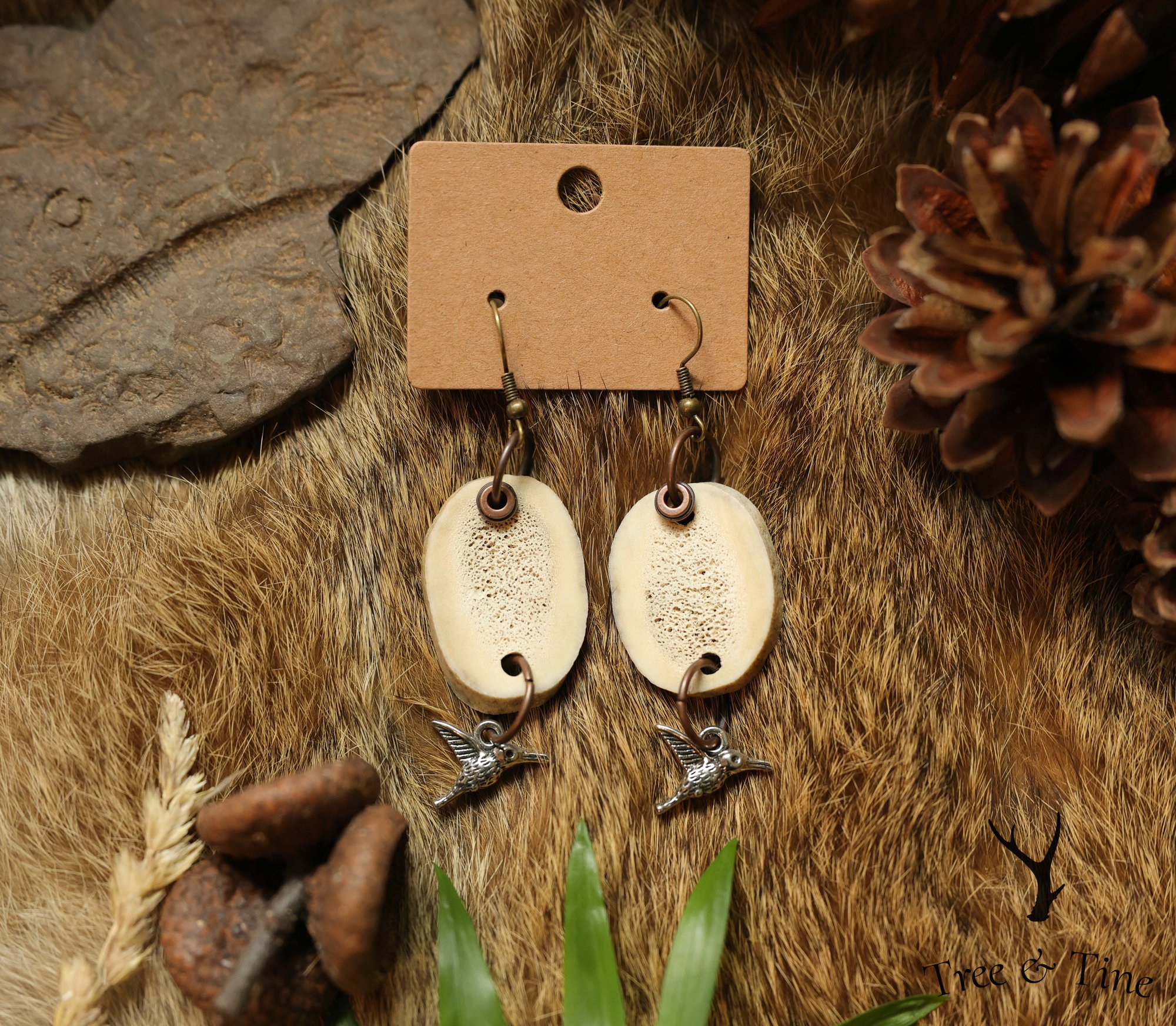 Beaded Antler Slab Earrings w/ Humming Bird Charm